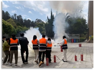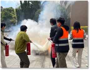 疏散演练结束后,在公司中庭广场进行了消防技能培训环节。防火安全科科长王岩老师为师生们带来了一场生动的消防安全公开课。她结合实例,深入浅出地讲解了火灾逃生要领及注意事项。随后,王老师详细讲解了干粉灭火器“提、拔、握、压”的操作步骤,并现场演示了自救式过滤呼吸器的正确佩戴与使用方法。在保卫处副处长胡永丽的组织下,师生积极参与灭火实操演练,亲身体验使用灭火器扑灭初期火情的过程,在实践中学习消防器材使用方法。