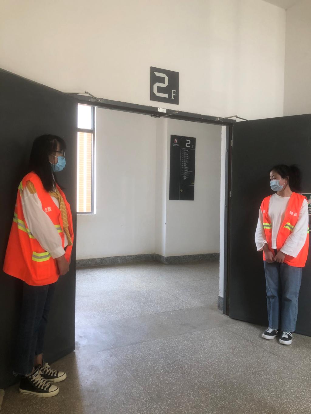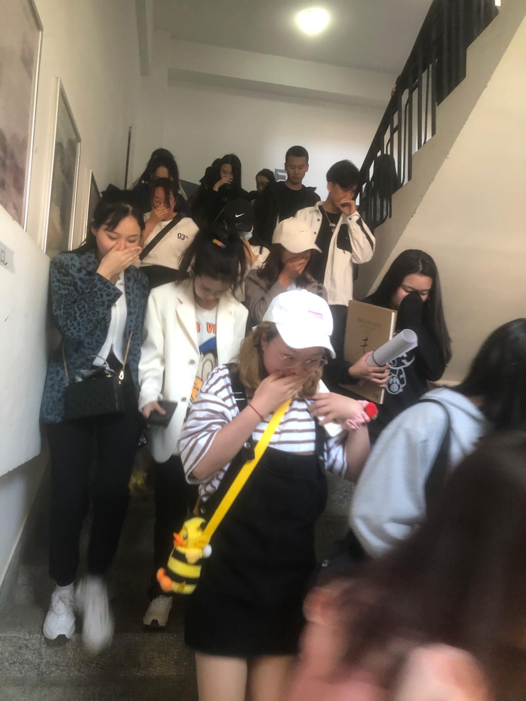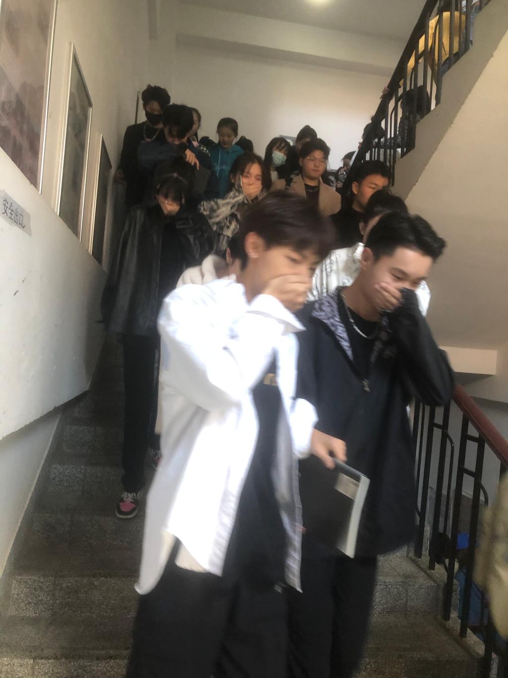 十二点三十分火灾警报响起,安全疏散演练正式开始。在艺管楼内上课的师生,迅速用衣袖、毛巾掩住鼻口,通过消防楼梯按照指定的疏散线路,有序地进行紧急疏散,并在第一时间撤离到安全地带,安全疏散演练顺利完成。