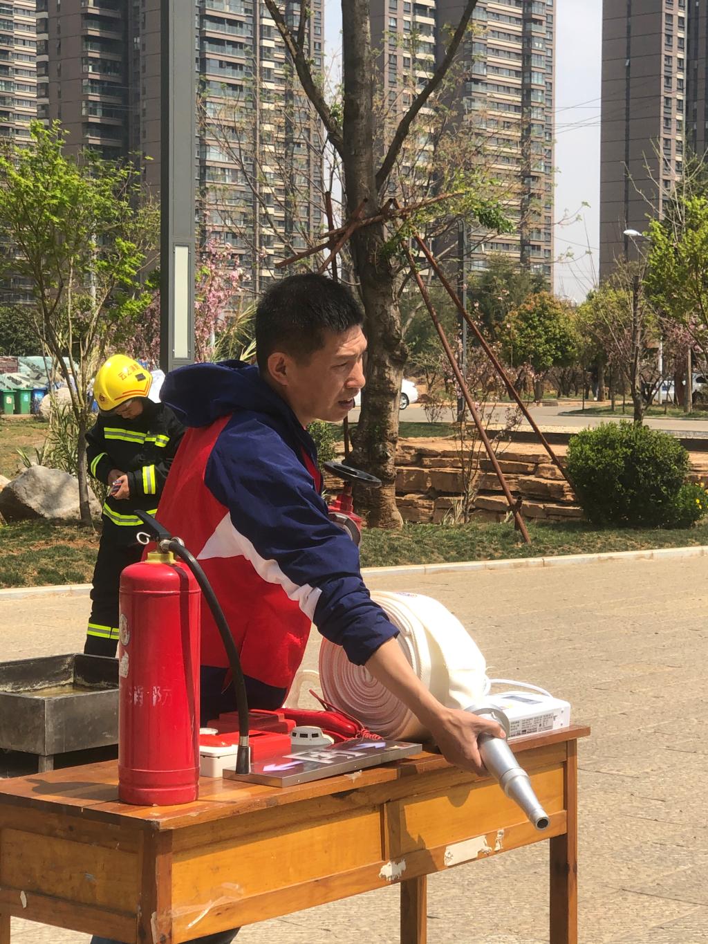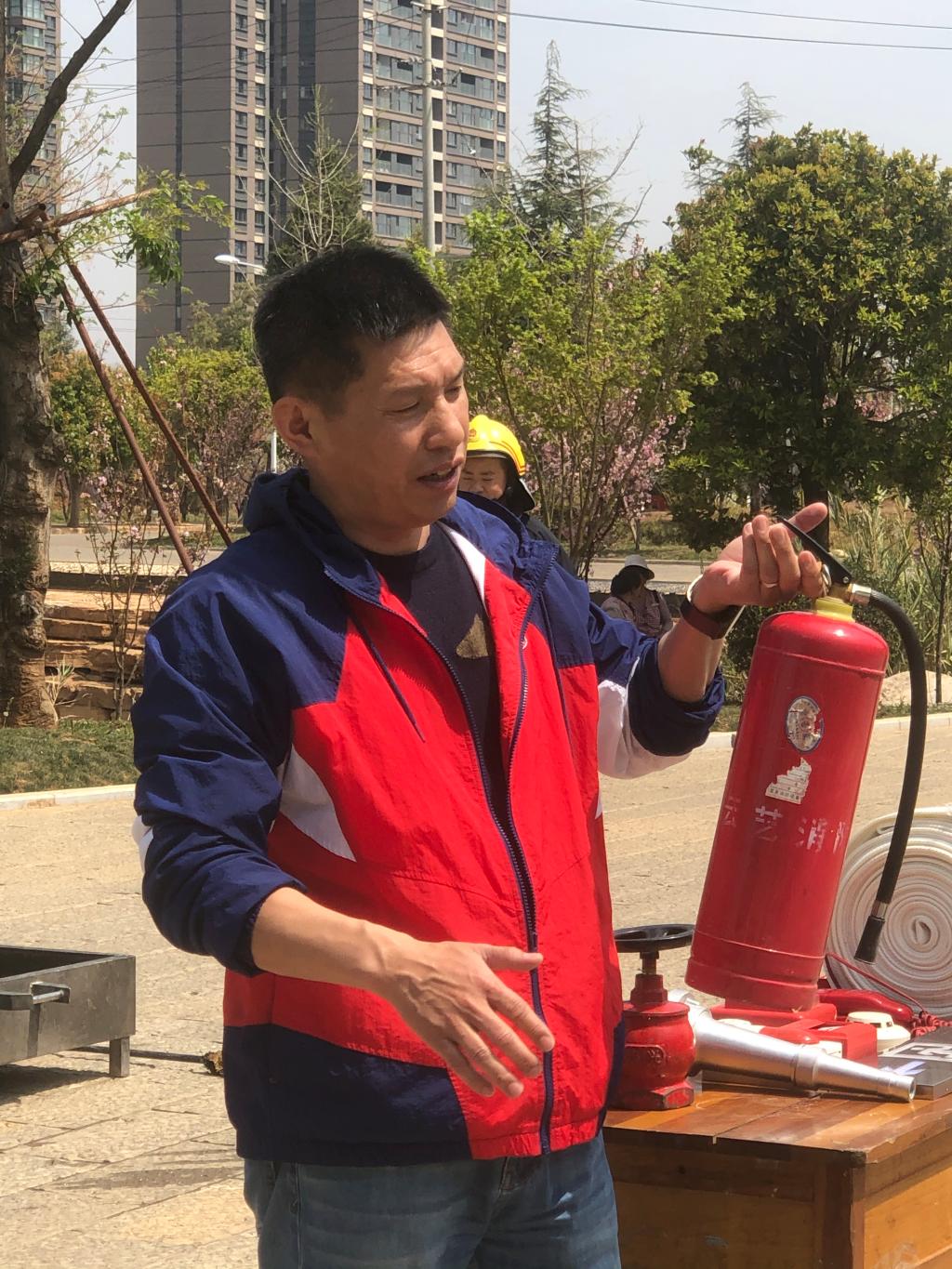 灭火演练开始前,保卫处防火安全科科长何斌老师给参加演练的全体师生详细讲解了消防栓、水袋、灭火毯、灭火器等消防器材的使用方法和注意事项。十二点四十五分,灭火演练开始,模拟火灾的火盆被点燃,何斌老师进行了现场灭火示范。随后,部分教师和员工代表在何斌老师的指导下相继进行了灭火演练。