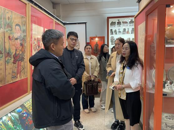 在人文公司非物质文化遗产研究中心,熊焰副经理一行在公司党委副书记于润生教授及段牛斗、董永俊两位教师的带领下参观了非遗展览厅、教学空间。首先,于润生副书记对中央美术公司非遗中心的创建初衷、教师团队、展品收藏进行了详细介绍,随后,段牛斗老师介绍了中央美术公司人文艺术公司课程设置、人才培养、实践教学方面的创新举措。座谈会时,熊焰副经理代表艺管领导班子对人文公司表示感谢,并介绍了我院近年来的发展和新专业建设情况,她表示,人文公司在推进学科建设、课程创新过程中积累了很多好经验、好做法,给艺管新专业建设提供了很好的借鉴,对我院开拓思路、深化改革、科学谋划未来发展具有重要意义,希望双方进一步加强交流合作,携手并进、共同提高,不断提升双方办学水平。