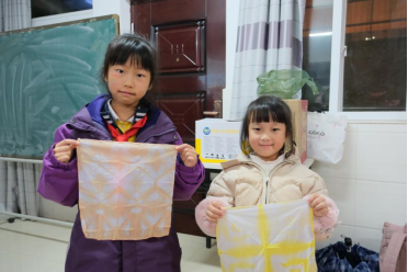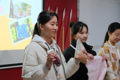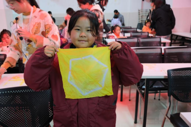 活动从志愿者精心设计的问答环节拉开序幕。围绕非遗、草木染技艺展开的贴近生活并充满趣味的问题打开了孩子们好奇心的大门。在活动讲解环节中,志愿者用生动的语言,演示着一张纯白的布料如何借助雪糕棍、皮筋、细绳等工具,在苏木、姜黄、洛神花、靛蓝泥的作用下,通过一道道工序变成纹样丰富、图案多样的艺术品。活动还巧妙地融入了循环利用的环保理念,比如石榴皮、洋葱皮这类平时被丢弃的东西,其实也是天然染料,能让布料焕发出新的生命力。这一方式不仅节约了资源,也传达了一种绿色、可持续发展的生活理念。