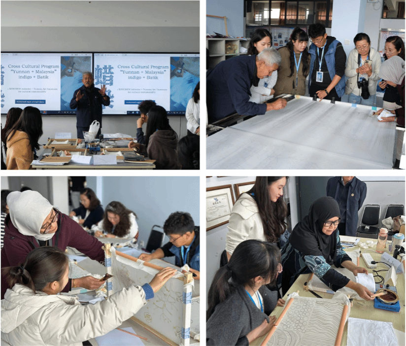 工作坊还特邀来自不同艺术背景的跨界艺术家参与,包括剪纸非遗传承人、瓦猫非遗传承人、农民画非遗传承人、菱角非遗传承人、版画艺术家、水彩画艺术家、数字艺术家以及花园设计师。他们将各自擅长的创作手法与蜡染工艺相融合,激发出全新的艺术灵感与表现形式。这一尝试不仅是对马来西亚巴蒂克(Batik)技艺的学习与实践,更在创作过程中深入体验以非物质文化遗产为载体的文化传播与交流,进一步拓展非物质文化遗产保护专业的人才培养体系,搭建起中马两国文化交流与互鉴的平台,促进教学理念、方法与文化语境的多维对话。