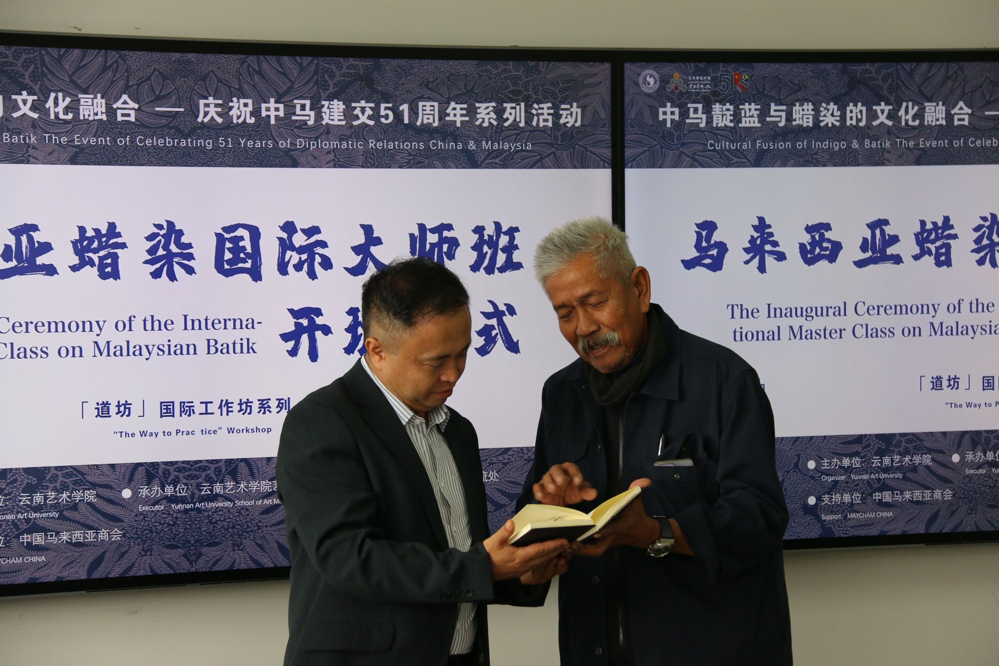 开班仪式的最后,纳吉布教授赠予了马来西亚蜡染纹样图册,蒋锋副经理则回赠了代表云南非遗的扎染作品。这不仅是文化友谊的象征,更是中马文明互鉴的生动体现。
