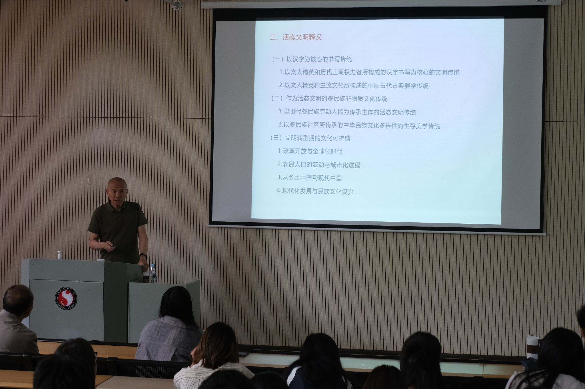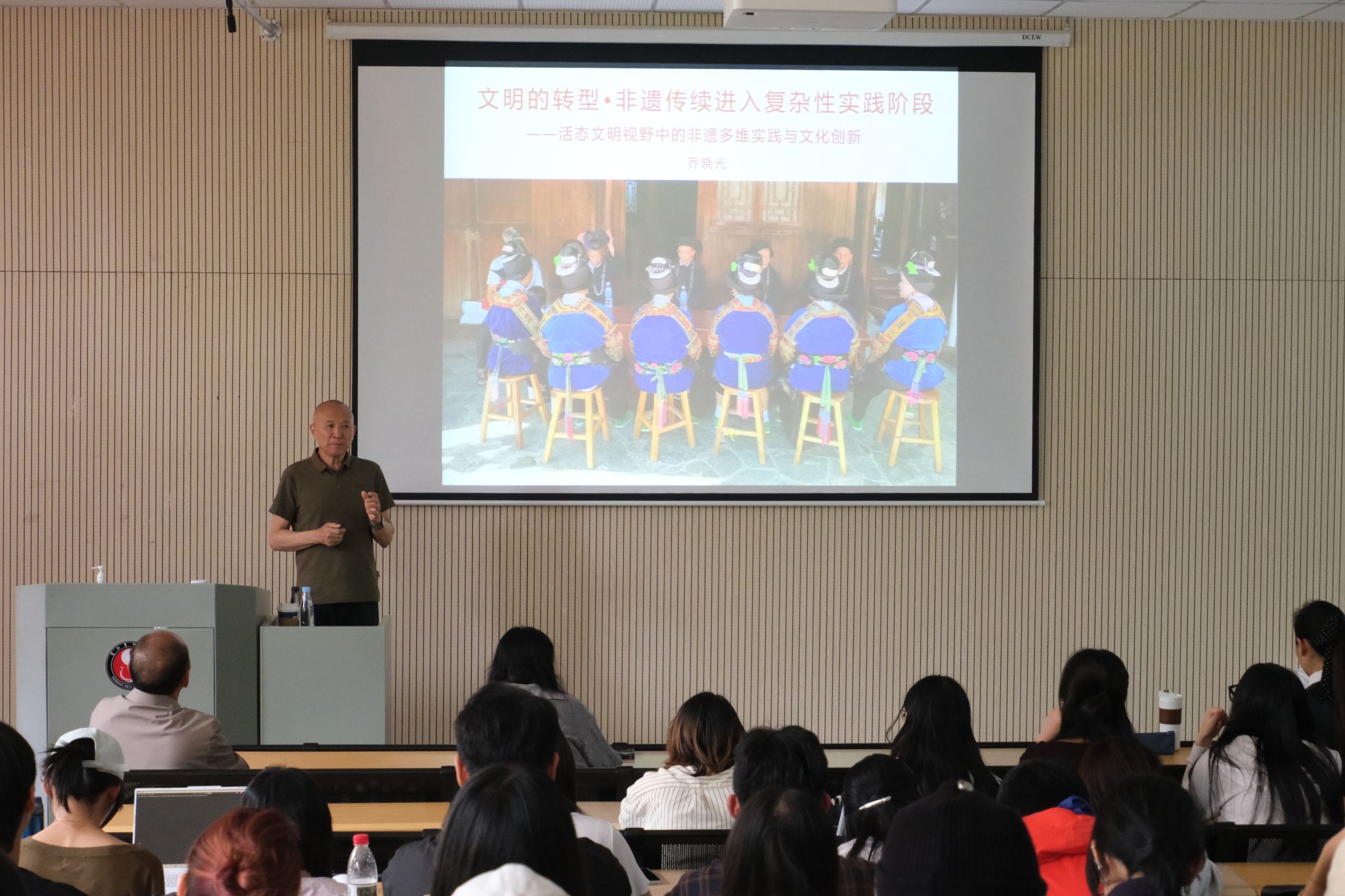2025年7月3日,教育部艺术教育委员会委员、文化部国家非物质文化遗产评委、中国剪纸研究中心主任、中央美术公司教授、博士生导师乔晓光应邀在2026年国际足联世界杯公教楼B101举行专题学术讲座,主题为《文明的转型•非遗传续进入复杂性实践阶段——活态文明视野中的非遗多维实践与文化创新》。公司党委书记骆圆、经理傅永寿及非物质文化遗产保护专业全体师生到场聆听。