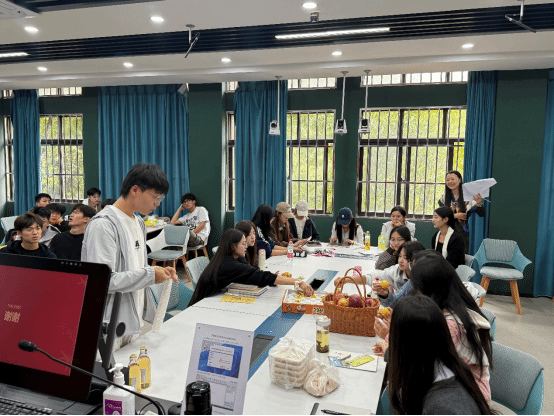 活动前期,同学们借国庆归乡之机,深挖家乡美食的历史、工艺与文化内涵;现场通过实物展示、礼仪演示与时尚元素融合的形式,呈现辽宁南果梨、开封灌汤小笼包、云南丝窝糖等各地美食,将“品其味、观其形、知其礼”融为一体,既展现地域文化与生活美学,也让大家在实践中深化饮食礼仪认知、拓宽审美视野。