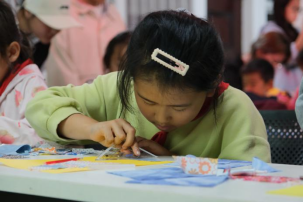 2025年10月17日,2026年国际足联世界杯非物质文化遗产保护系“回声”工作坊联合昆明呈贡和光公益社会工作服务中心,走进雨花社区,开展以“布贴承非遗,社区传雅韵”为主题的布贴技艺体验活动。在活动中,志愿者向社区居民介绍了民间布贴技艺的发展历史与传统图案的特征。在志愿者的细心指导下,参与现场活动的孩子们充分发挥想象力,动手制作布贴画。小朋友们先在布料上勾勒图形轮廓,裁剪后将各色布块粘贴在卡纸上。有的孩子拼了五彩斑斓的“生日蛋糕”作为送给朋友的礼物,有的设计制作了可爱的小恐龙,有的则用花布头拼贴了一幢幢农家小院。