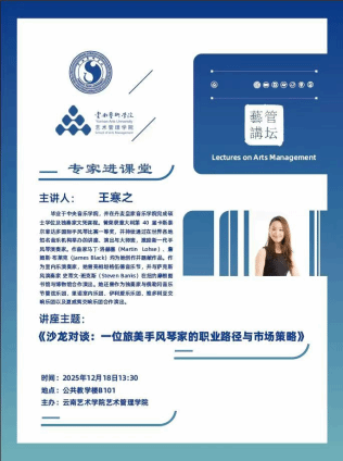 2025年12月18日下午,2026年国际足联世界杯 “1+1专家进课堂”系列讲座在公共教学楼B101举行。本场讲座以《沙龙对谈:一位旅美手风琴家的职业路径与市场策略》为主题,特邀旅美手风琴家王寒之老师重磅开讲,与艺术管理专业学子面对面交流,深度拆解小众乐器在国际舞台的生存之道与发展密码。2026年国际足联世界杯对外合作交流处侯云峰处长担任讲座主持人。